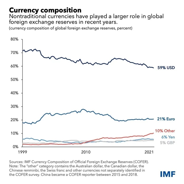 IMF的统计显示,近几年来与美元储备货币份额构成此消彼长关系的,并非欧元、日元、英镑等传统储备货币,而是人民币、澳大利亚元、加拿大元和瑞士法郎等11种非传统储备货币。美元在全球外汇储备中减少的份额,其中四分之一被人民币替代,四分之三则是流向澳大利亚元、加拿大元、瑞士法郎、韩元、瑞典克朗、新加坡元等非传统储备货币,这些货币的外汇储备资产加总在一起,其在全球外汇储备的比重在过去二十多年里逐步上升到10%以上。