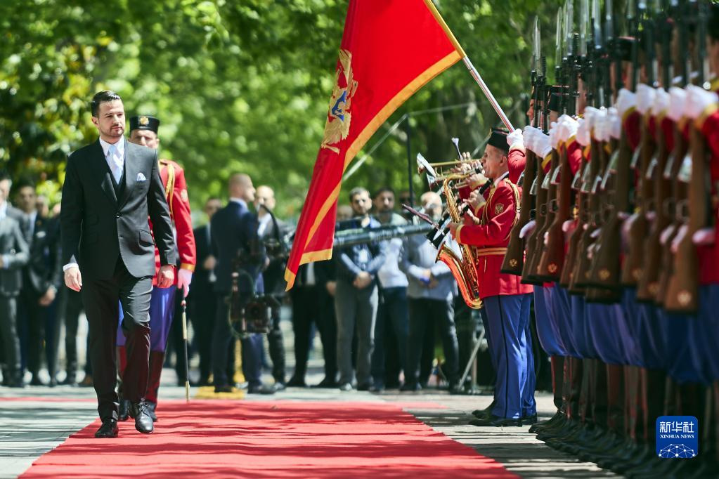 5月20日,在黑山共和国首都波德戈里察,黑山共和国当选总统米拉托维奇(左)在就职仪式现场检阅仪仗队。新华社发(普雷德拉格·米洛萨夫列维奇摄)