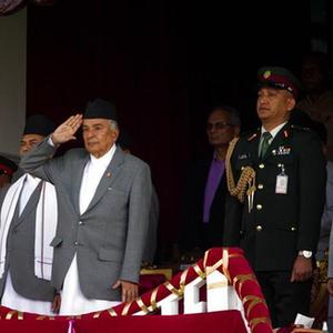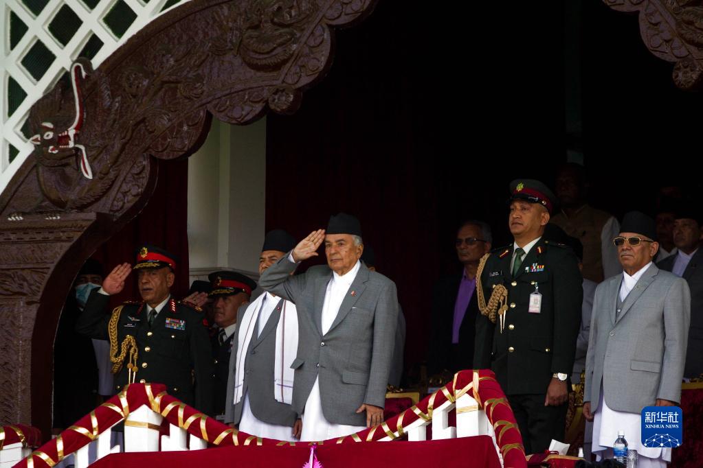 5月29日,尼泊尔总统拉姆·昌德拉·鲍德尔(中)在加德满都出席共和日庆祝活动。