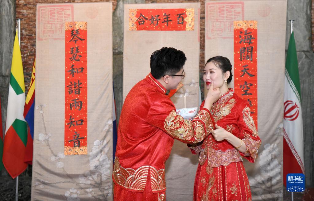 6月7日,在瑞士日内瓦,中国常驻联合国日内瓦办事处和瑞士其他国际组织代表团的新郎齐林和新娘张秋若在以亚洲婚俗文化为主题的第三届日内瓦“亚洲文化节”上举办中式婚礼。新华社记者 连漪 摄