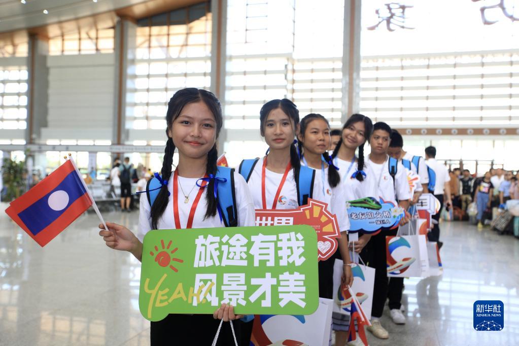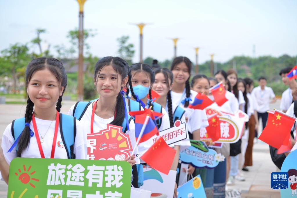 6月21日,在老挝万象,老挝学生准备乘坐“澜沧号”动车组。新华社发(凯乔摄)