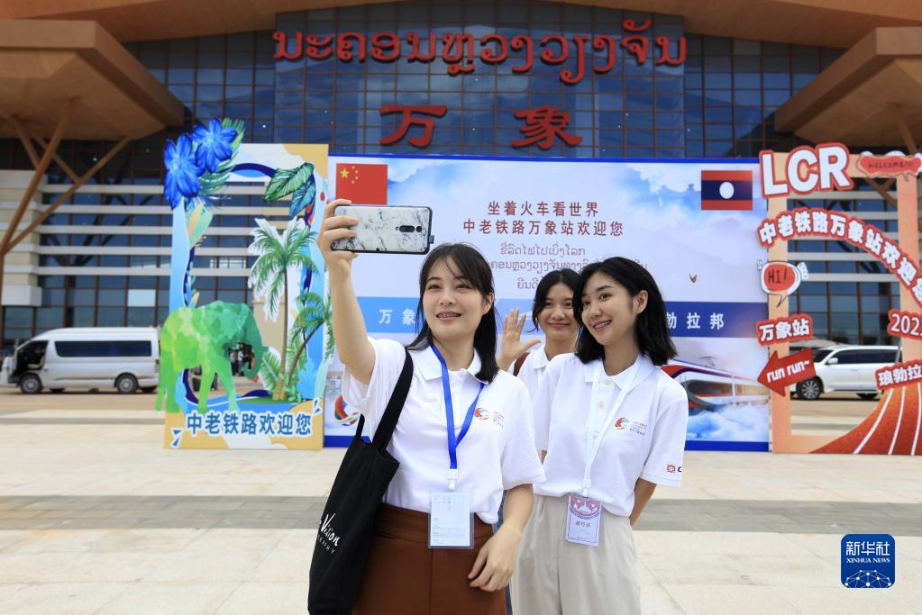 6月21日,在老挝万象,老挝青年乘坐“澜沧号”动车组前拍照。新华社发(凯乔摄)