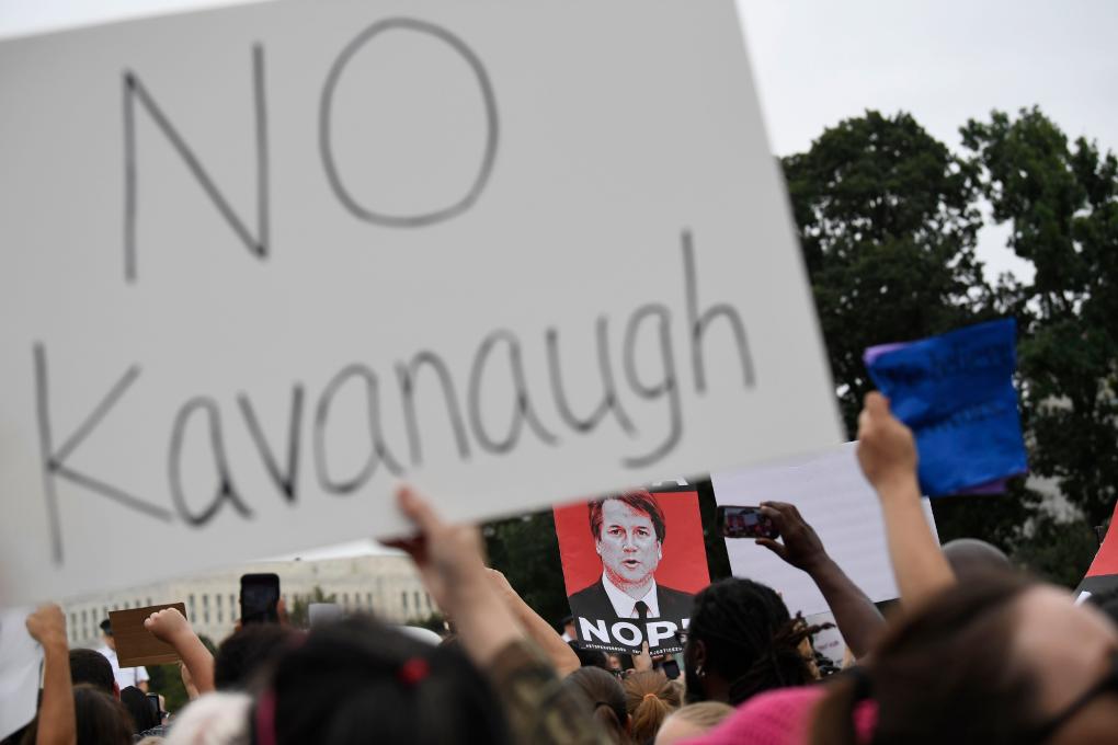 2018年10月6日,在美国首都华盛顿联邦最高法院前,抗议者反对卡瓦诺出任联邦最高法院大法官。新华社记者刘杰摄