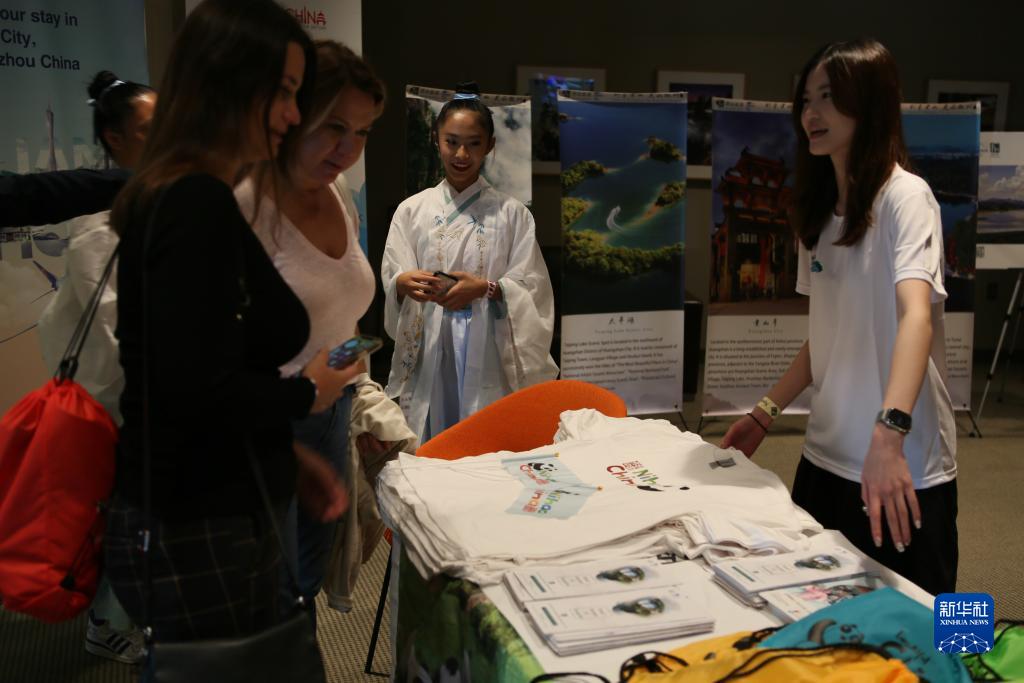 9月1日,在美国纽约花旗球场,一名工作人员在“中华之夜”暨“你好!中国”旅游推广品牌发布活动上为观众介绍情况。新华社记者 张凤国 摄
