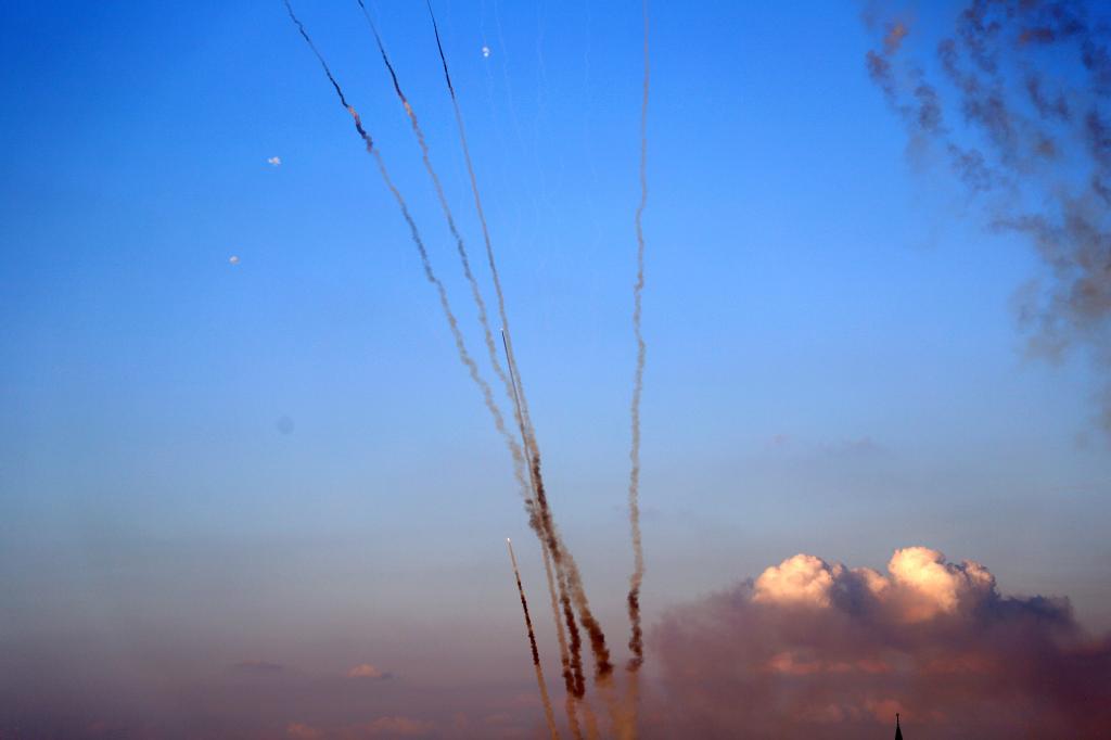 这是10月10日在加沙城拍摄的向以色列发射的火箭弹。新华社发(里泽克·阿卜杜勒贾瓦德摄)