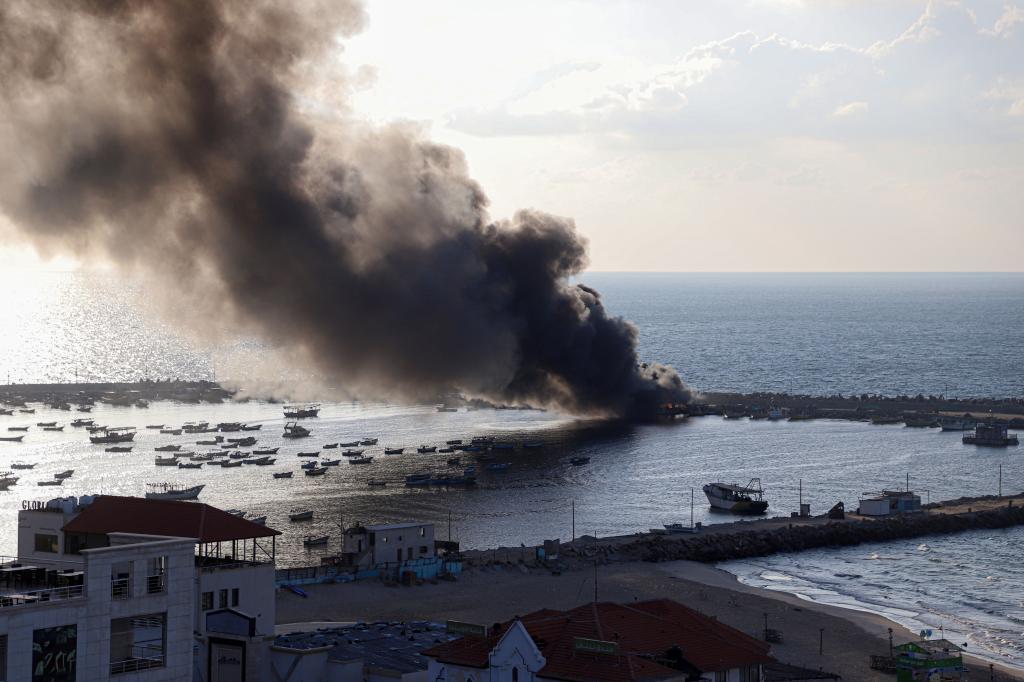 10月10日,加沙城港口遭以色列袭击后升起浓烟。新华社发(里泽克·阿卜杜勒贾瓦德摄)