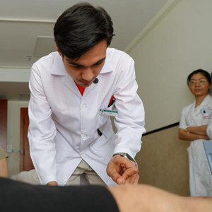 2023年7月28日,甘肃中医药大学针灸推拿专业的土库曼斯坦留学生迪达(右)在老师指导下为患者进行针刺治疗。 新华社记者 陈斌 摄