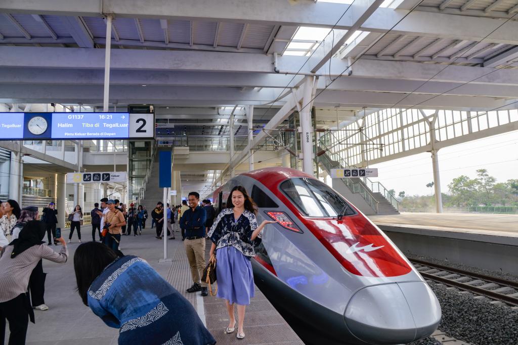 10月17日,在印度尼西亚万隆德卡鲁尔站,乘客在站台上和雅万高铁高速动车组列车合影。新华社记者 徐钦 摄
