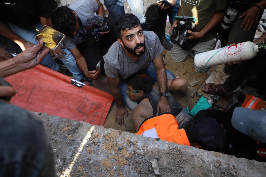 11月6日,人们从加沙地带南部城市汗尤尼斯的一处废墟中救出一名幸存者。新华社发(里泽克·阿卜杜勒贾瓦德摄)