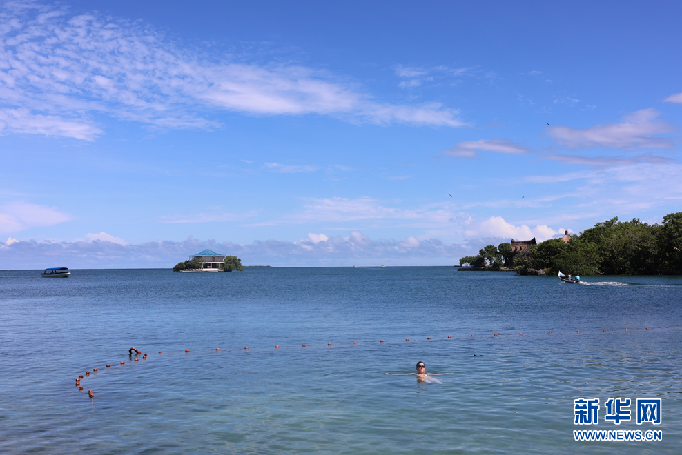游客在卡塔赫纳港口的海水中游泳。唐薇 摄