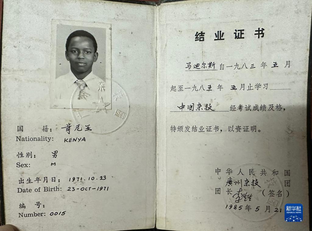 这是11月11日拍摄的马蒂亚斯在广州杂技团的结业证书(手机拍摄)。