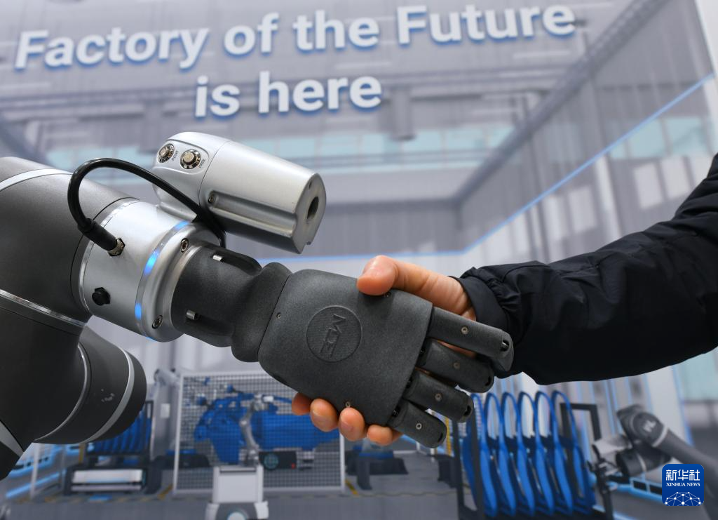 2023年4月19日,在德国汉诺威工业博览会上,参观者与一款智能机器人握手。