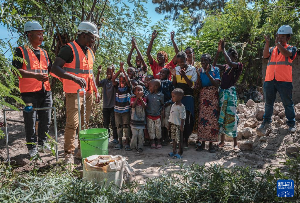 2023年6月13日,在坦桑尼亚姆万扎省米松圭,卫星城供水项目工程师凯尔文(左二)打开水龙头接通水管,赢得当地居民鼓掌欢呼。