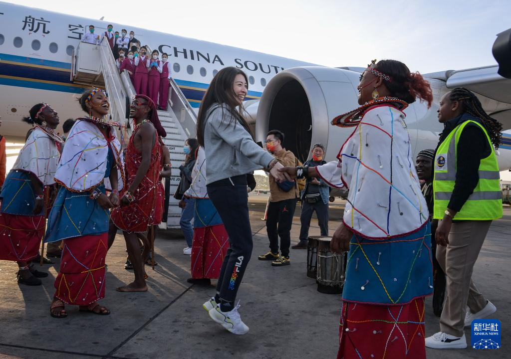 2023年2月11日,身着民族服饰的肯尼亚年轻人在首都内罗毕的乔莫·肯雅塔国际机场欢迎中国游客抵达。这是中国试点恢复出境团队旅游后首批抵达肯尼亚的中国旅行团。