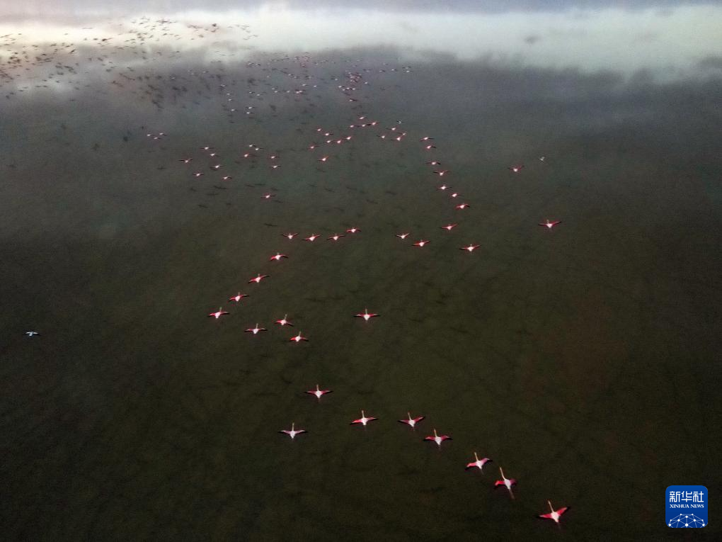 2023年2月26日,火烈鸟在土耳其首都安卡拉附近的湖面上飞翔(无人机照片)。