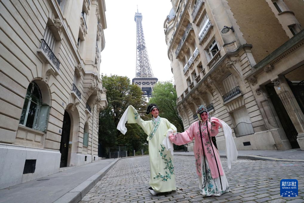2023年9月13日,来自中国江苏省的昆曲演员施夏明(左)和孔爱萍在法国巴黎埃菲尔铁塔附近参加昆曲快闪活动,展示昆曲艺术魅力。