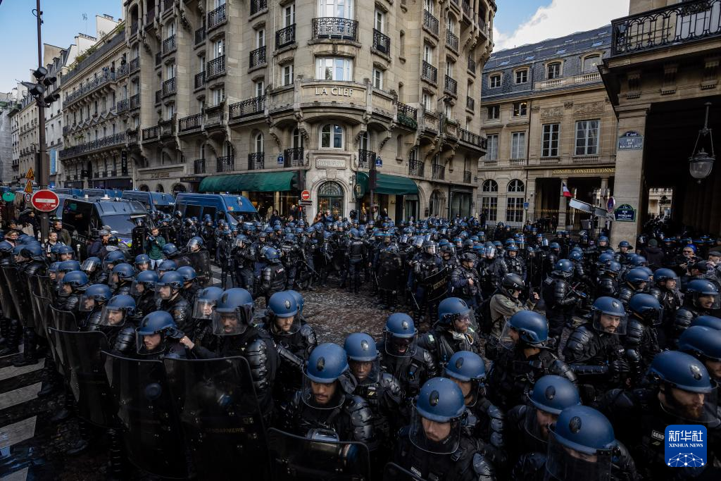 2023年4月13日,宪兵和警察在法国首都巴黎的宪法委员会大门外警戒,以应对大规模反退休制度改革的罢工游行。