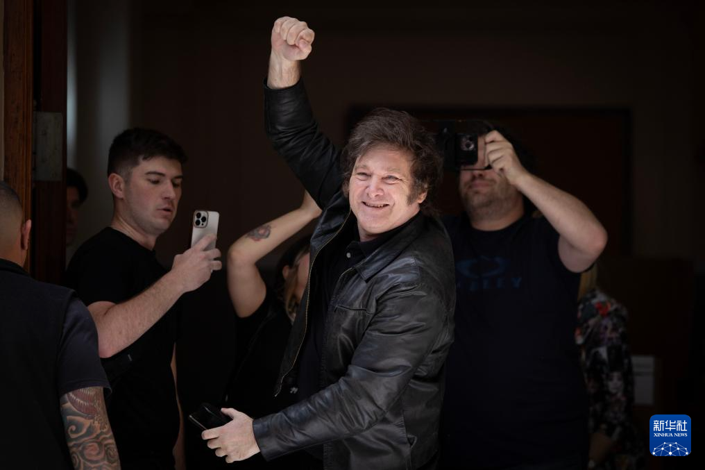 2023年11月19日,阿根廷极右翼选举联盟“自由前进党”候选人哈维尔·米莱在首都布宜诺斯艾利斯的投票站向民众致意。哈维尔·米莱在总统选举第二轮投票中胜出,当选阿根廷新一届总统。