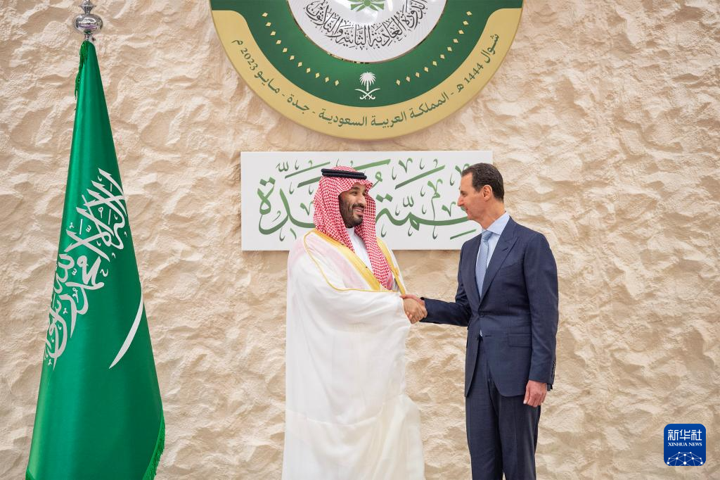 2023年5月19日,在沙特阿拉伯吉达举行的阿拉伯国家联盟首脑理事会会议上,沙特王储兼首相穆罕默德(左)欢迎叙利亚总统巴沙尔。