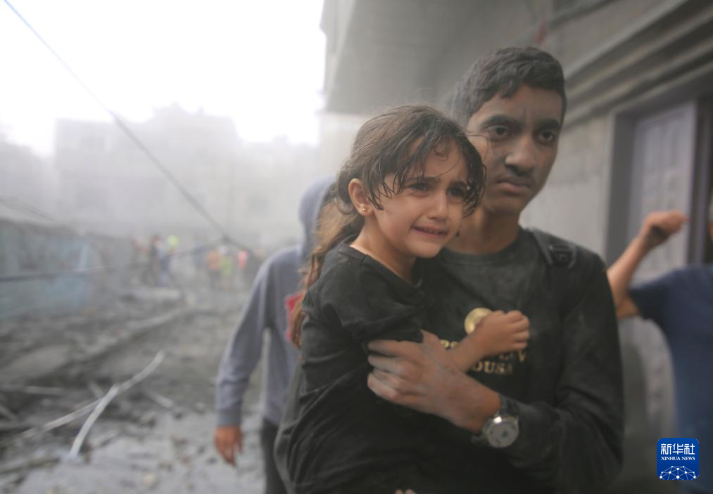 2023年10月12日,在加沙地带南部城市拉法,一名男子抱着小女孩离开遭以军空袭的建筑。