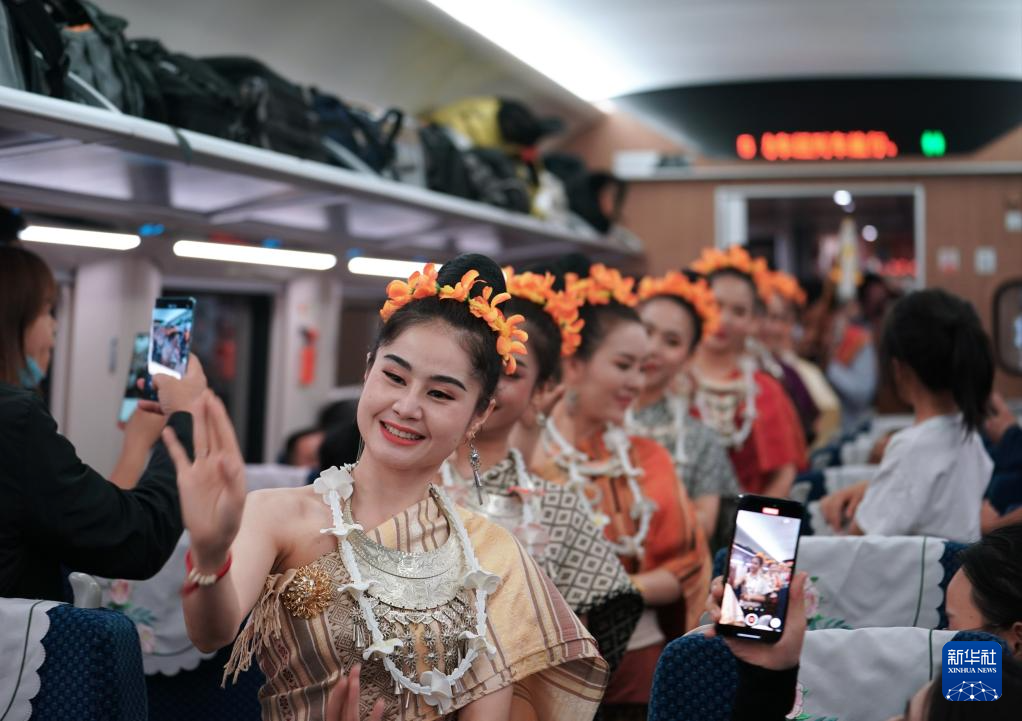 2023年4月13日,老挝工作人员在D887次国际旅客列车上表演。