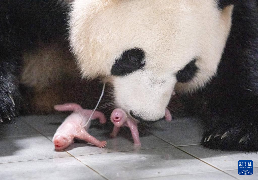 2023年7月7日,在韩国京畿道龙仁市的爱宝乐园里,旅韩大熊猫“爱宝(华妮)”照看刚诞生的大熊猫双胞胎幼崽。
