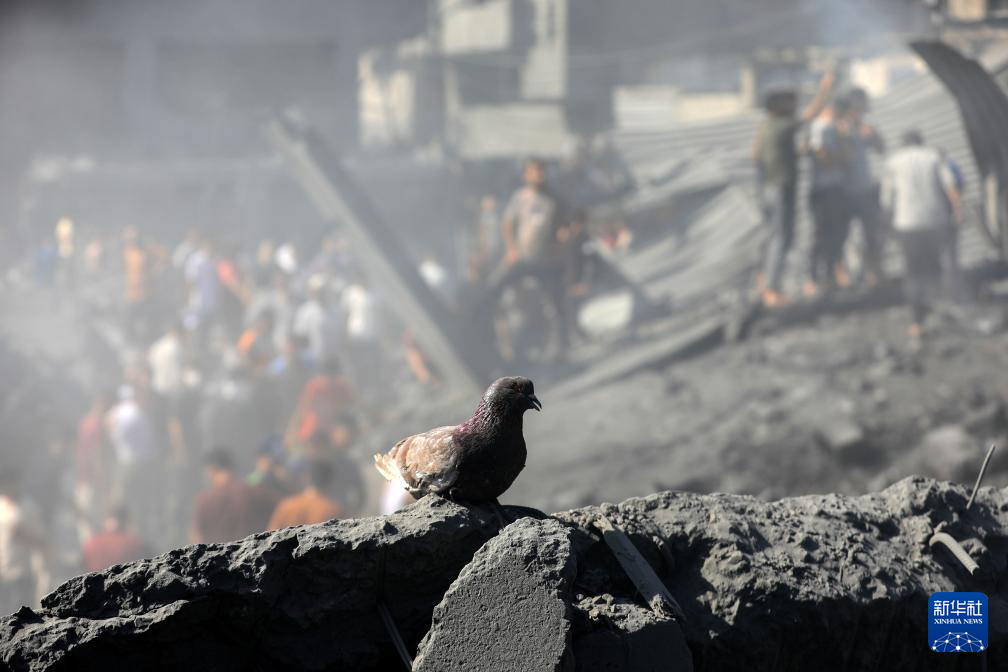 2023年10月26日,在加沙地带南部城市汗尤尼斯,一只鸽子停留在以军袭击后留下的建筑废墟上。