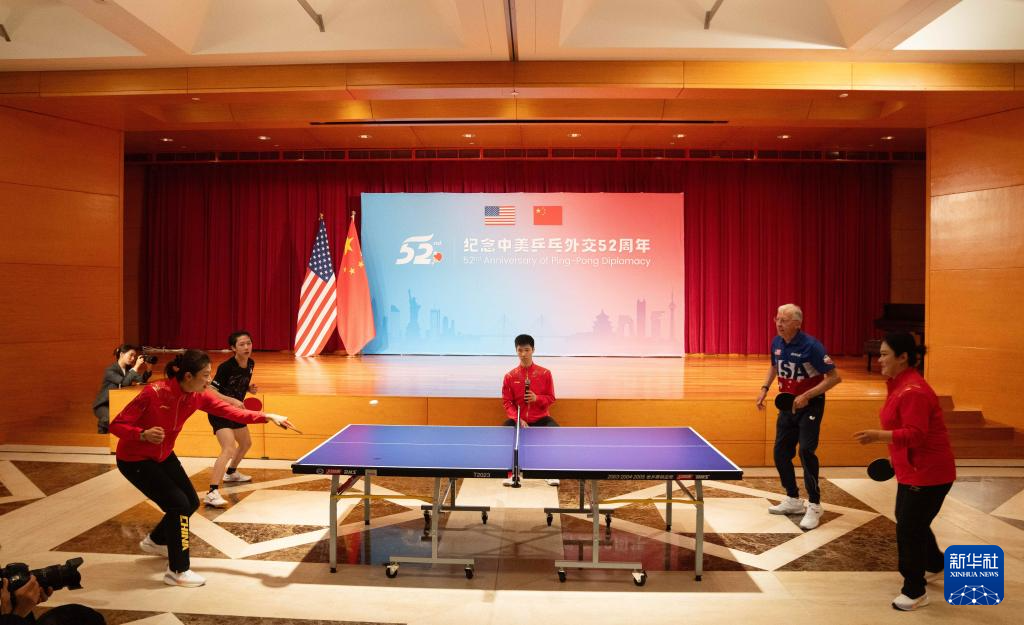 2023年12月13日,在美国首都华盛顿举行的中美“乒乓外交”52周年纪念活动上,世界冠军刘伟(右一)、丁宁(左一)等与美国乒乓球爱好者一起切磋球艺。