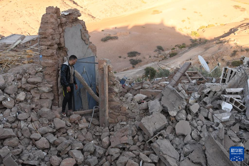 2023年9月9日,在摩洛哥马拉喀什南部一处村庄,一名男子查看在地震中损毁的建筑。