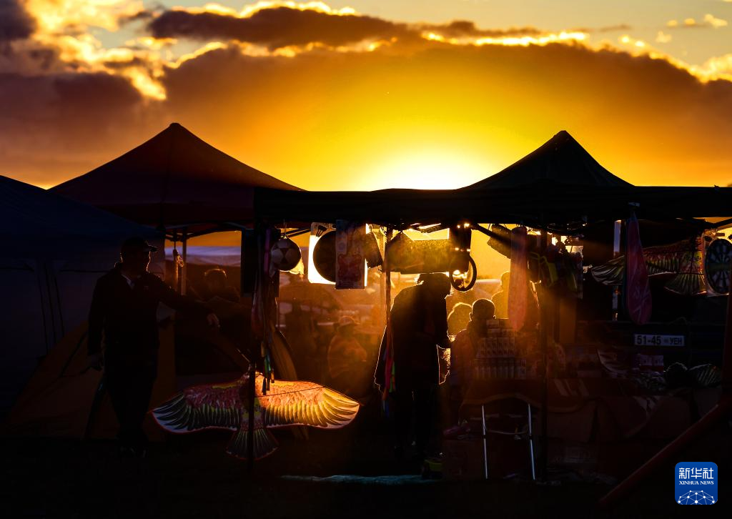 2023年8月18日,在蒙古国泰吉山谷,出售当地手工艺品的商店在金色的夕阳下营业。