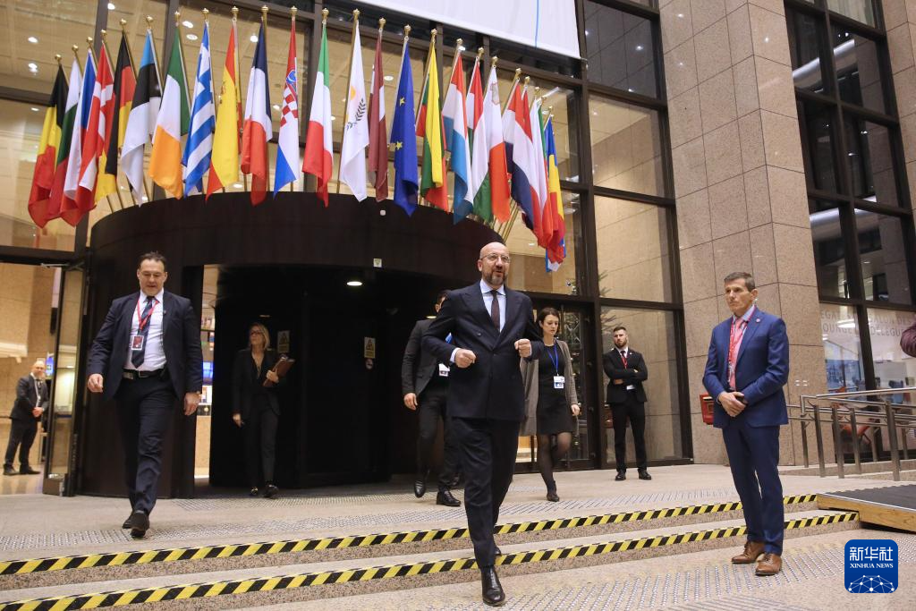 2023年12月15日凌晨,在比利时布鲁塞尔,欧洲理事会主席米歇尔(中)在欧盟峰会首日会议结束后准备接受媒体记者采访。
