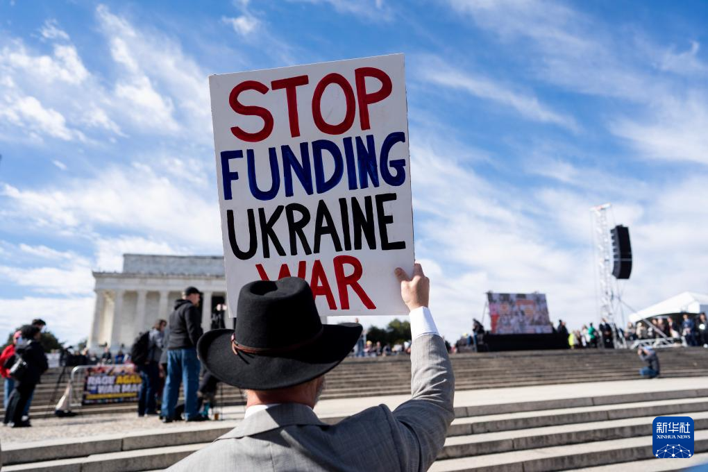 2023年2月19日,在美国首都华盛顿的林肯纪念堂前,抗议者手举标语参加集会,要求美国停止煽动俄乌冲突。