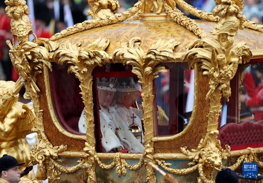 2023年5月6日,英国国王查尔斯三世的加冕仪式在伦敦举行,查尔斯三世和王后卡米拉乘马车从威斯敏斯特教堂返回白金汉宫。