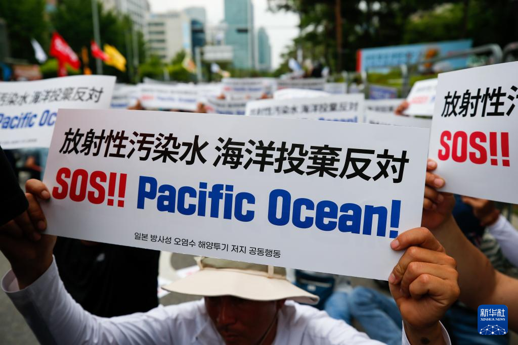 2023年6月12日,来自韩国各地的数千名渔民在韩国首尔手举标语牌参加集会,反对日本核污染水排海。