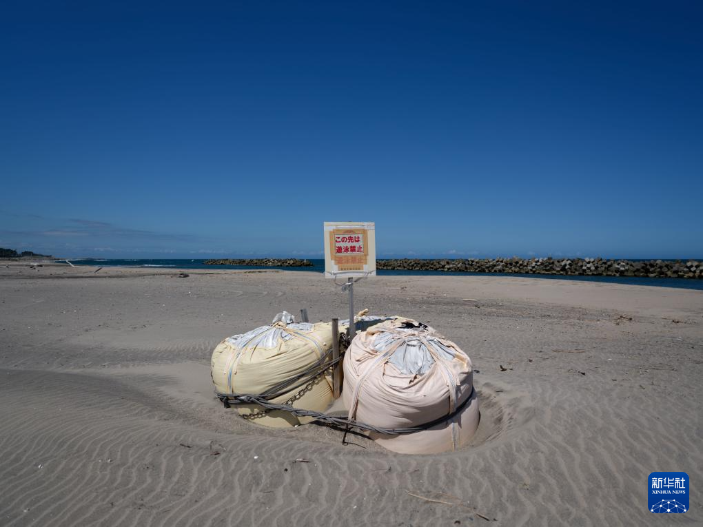 这是2023年8月22日在日本福岛县相马郡新地町钓师浜海水浴场拍摄的“禁止游泳”的告示牌。