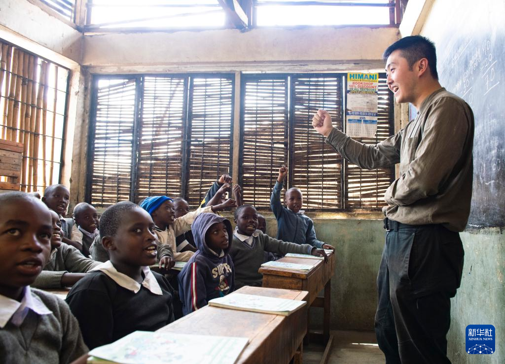 2023年4月19日,在肯尼亚首都内罗毕,公益组织成员刘宜孟翰向贫民区小学捐赠图书,鼓励孩子们从小培养阅读习惯。