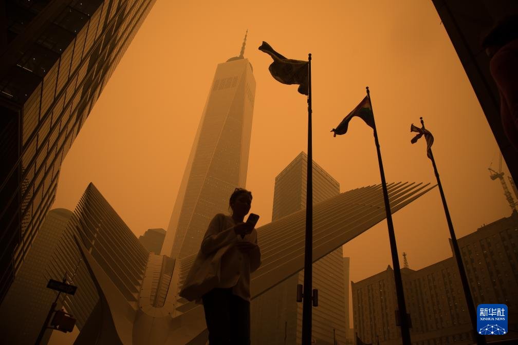 2023年6月7日,行人从烟尘笼罩的美国纽约曼哈顿世贸中心附近走过。加拿大多地森林野火产生的大量烟霾南移,美国纽约市空气出现严重污染,民众生活受到影响。