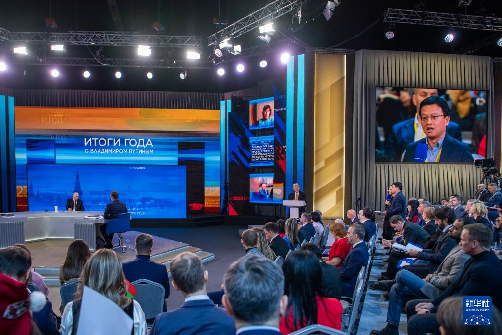 2023年12月14日,俄罗斯总统普京在首都莫斯科举行的“年度盘点”活动上回答新华社记者提问。