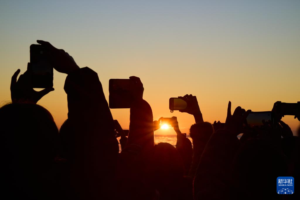 2023年1月1日,人们在日本茨城县大洗町的海边拍摄新年日出。