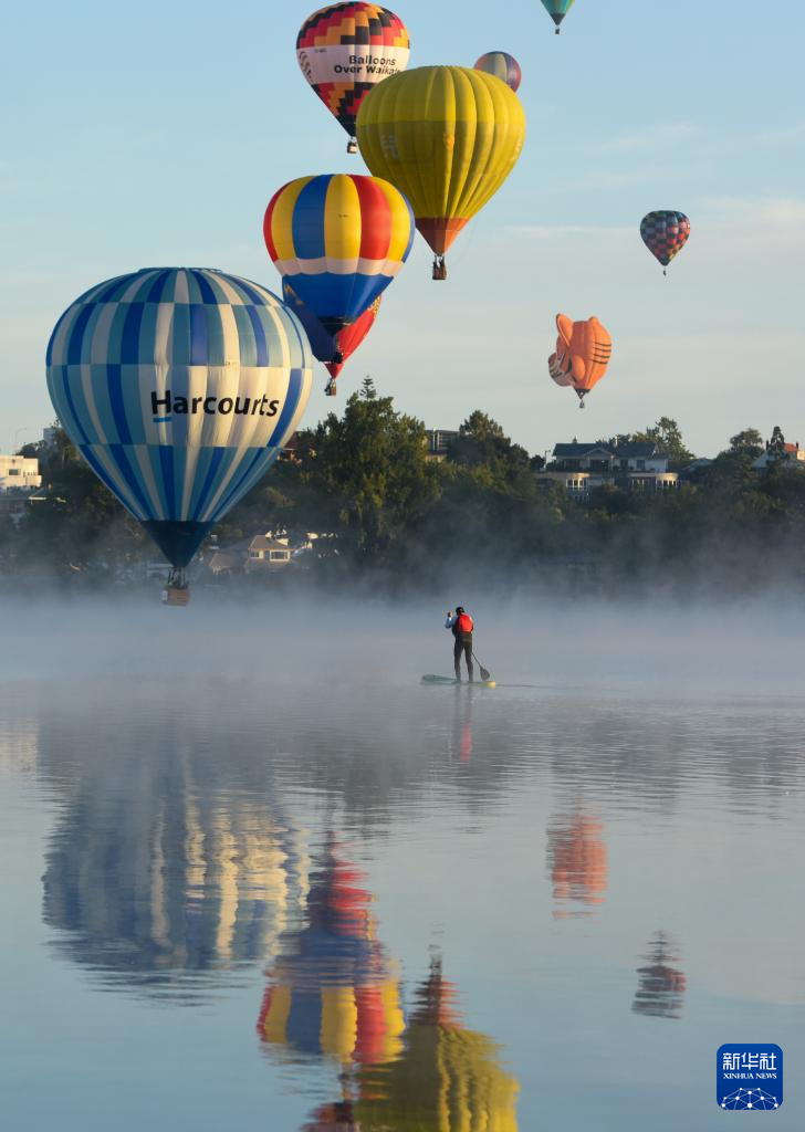 2023年3月15日清晨,在新西兰汉密尔顿举行的怀卡托热气球节上,热气球陆续升空。