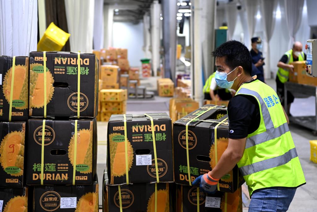 2023年9月12日,在广西凭祥友谊关口岸,工作人员搬运等待通关的榴莲。近年来,越来越多东盟国家的榴莲更加便捷地进入中国市场,并以更加优惠的价格走上消费者的餐桌。新华社记者曹祎铭摄