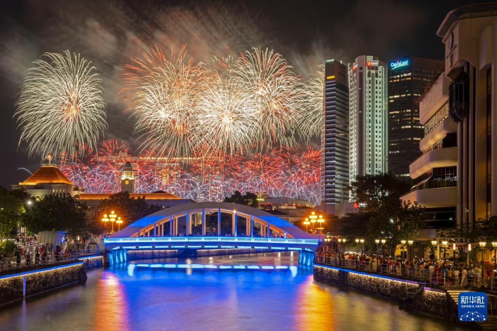 这是2023年8月9日,烟花绽放在新加坡滨海湾上空。