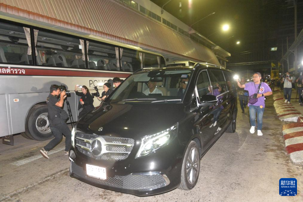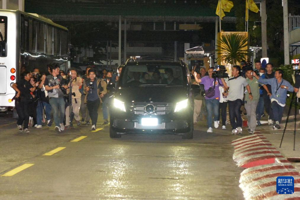 2月18日清晨,在泰国曼谷的泰国警察医院,在此治疗和服刑的他信乘车离开。泰国前总理他信18日获假释。新华社发(拉亨摄)
