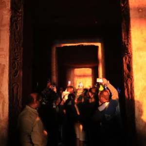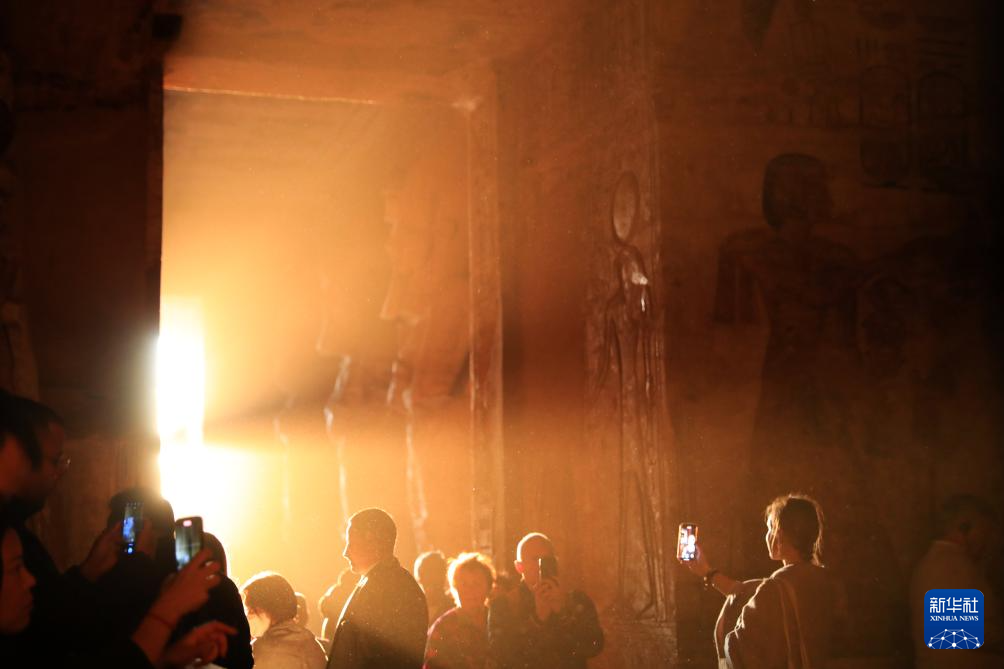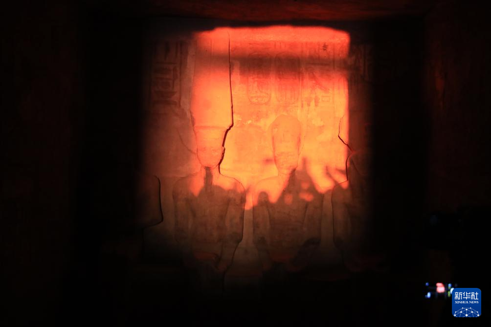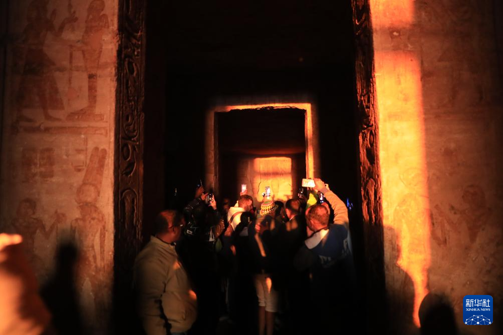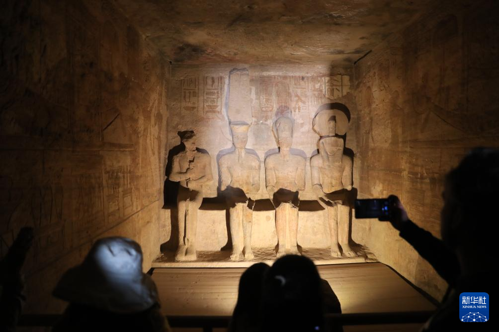 2月22日,在埃及南部阿斯旺省的阿布·辛拜勒神庙,游客拍摄被阳光照亮的雕像。