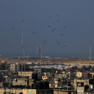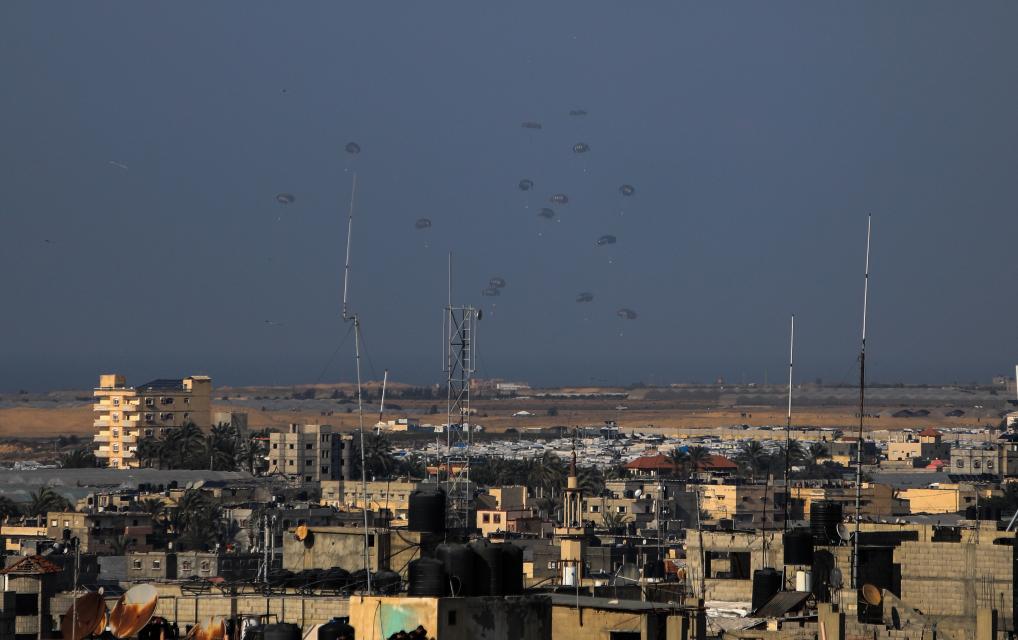 这是2月27日拍摄的向加沙地带空投的救援物资。约旦武装部队27日发表声明说,约旦皇家空军当天向巴勒斯坦加沙地带空投了一批救援物资。声明说,3架约旦皇家空军的飞机和3架分别来自阿拉伯联合酋长国、埃及和法国的飞机当天从位于约旦首都安曼的阿卜杜拉二世空军基地起飞,执行向加沙地带空投救援物资和食品的任务。新华社发(亚西尔·库迪摄)
