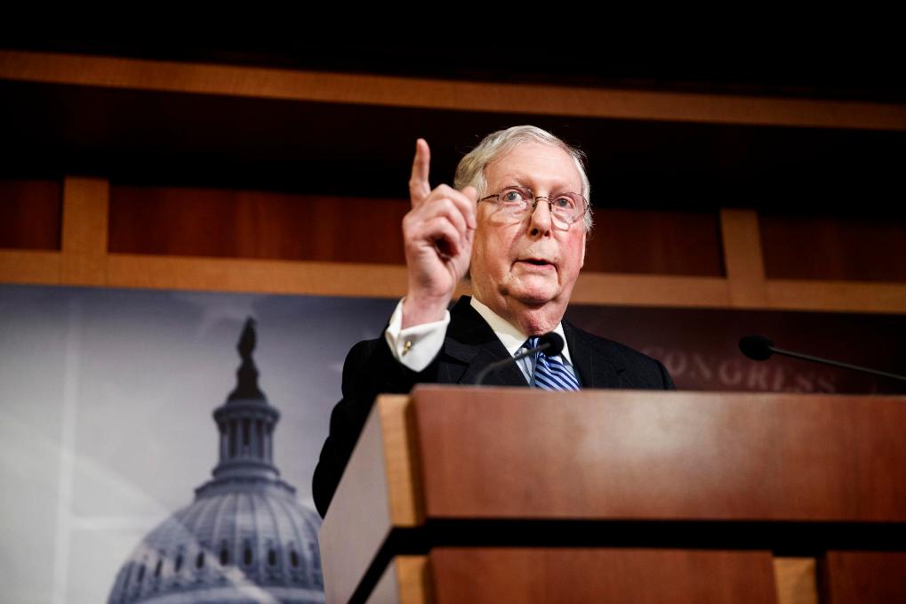 2020年2月5日,在美国华盛顿,美国国会参议院共和党领袖麦康奈尔在特朗普弹劾案投票结束后举行记者会。新华社发(沈霆摄)