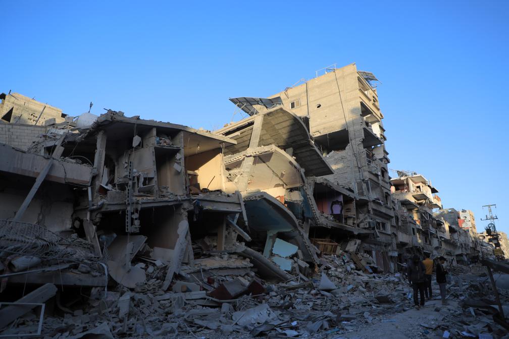 3月6日,在加沙地带南部城市汗尤尼斯,人们经过建筑废墟。新华社发(里泽克·阿卜杜勒贾瓦德摄)