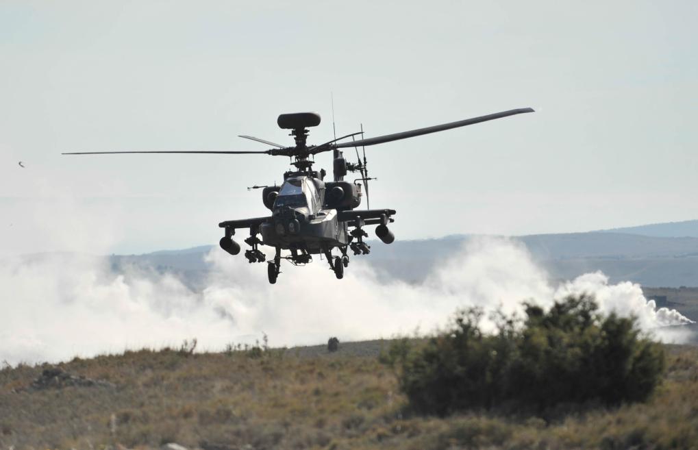 2015年11月4日,在西班牙萨拉戈萨举行的陆空联合作战演习中,“阿帕奇”武装直升机进入演习区域。新华社记者谢海宁摄