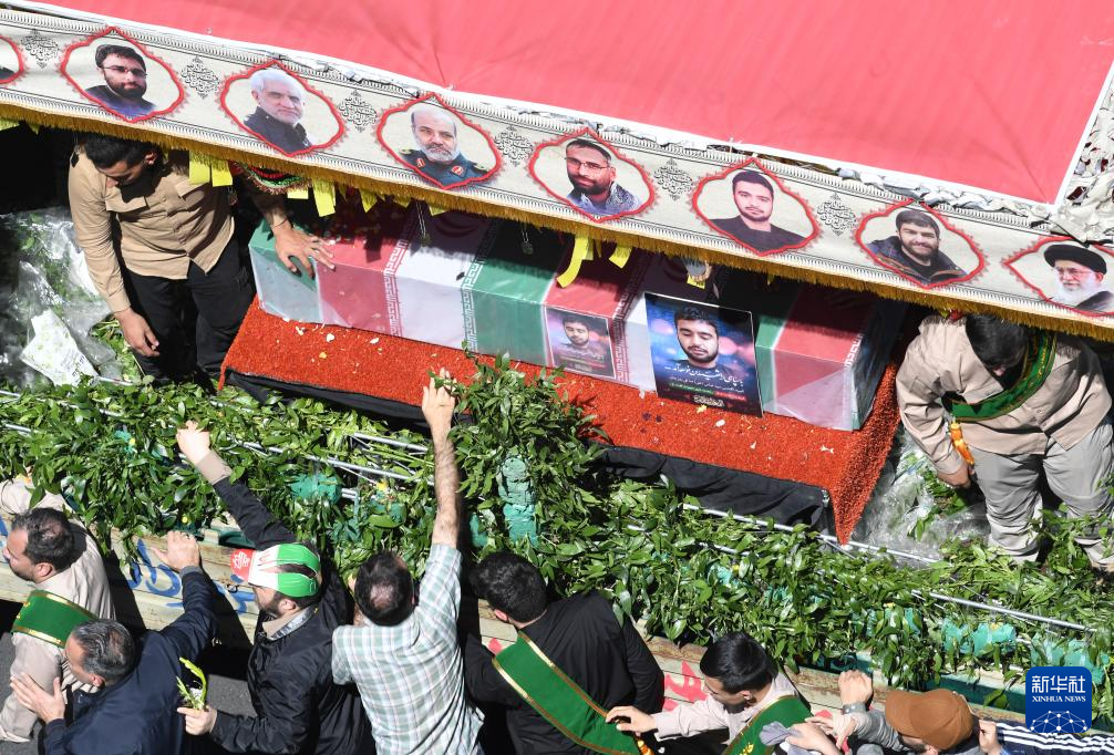 4月5日,在伊朗德黑兰,人们参加伊朗驻叙使馆遭袭事件中丧生的7名伊朗伊斯兰革命卫队成员的葬礼。新华社记者 沙达提 摄