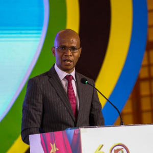 4月15日,坦桑尼亚外交与东非合作部部长马坎巴在坦桑尼亚达累斯萨拉姆举行的中坦建交60周年招待会现场致辞。新华社发(赫尔曼·埃马纽埃尔摄)